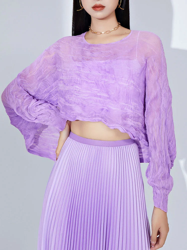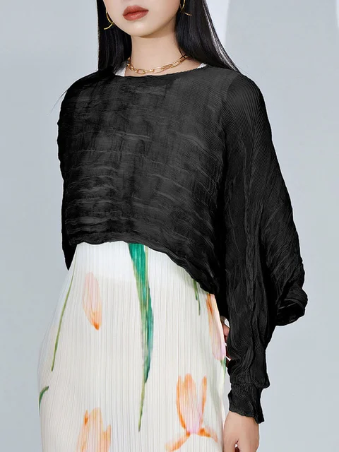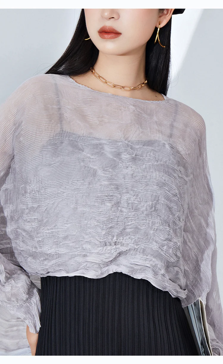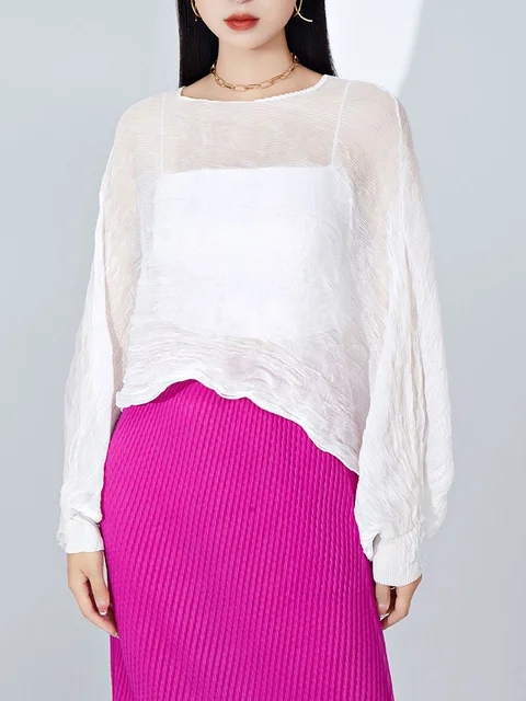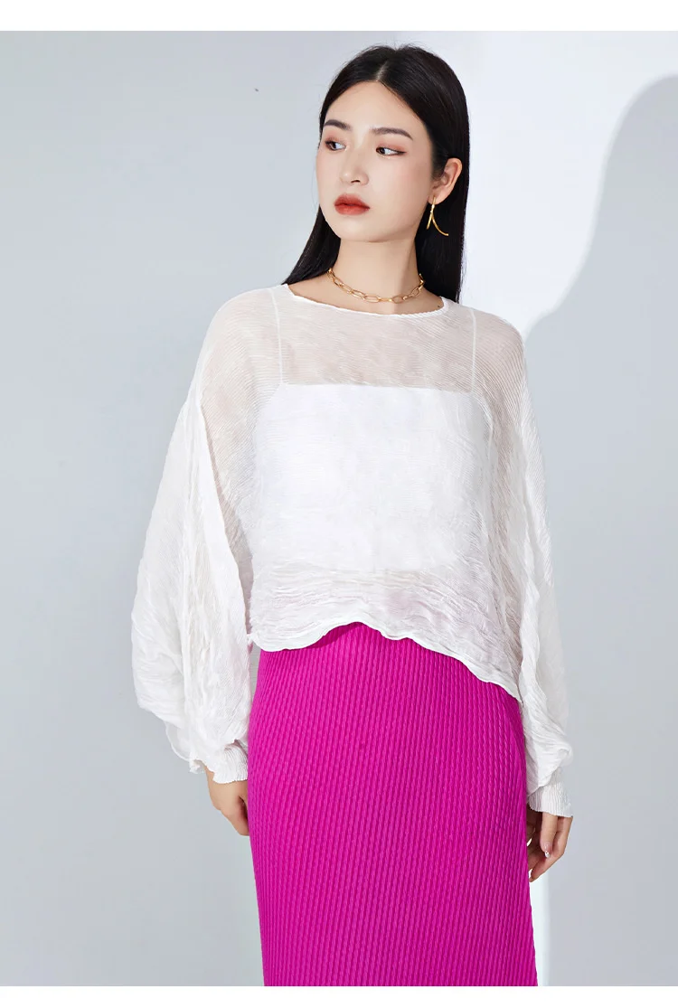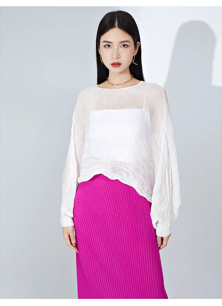 Pleated Long Sleeve Blouse For Women Round Collar Solid Color Summer Elegant Female Casual Breathable Clothing